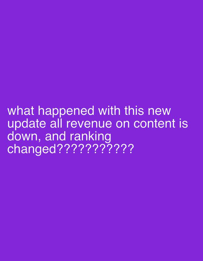 The image displays white text set against a solid purple background. The text, positioned in the lower portion of the frame, reads: "what happened with this new update all revenue on content is down, and ranking changed????????????" The background is uniformly purple, without discernible patterns or textures. No people, physical objects, actions, or interactions are depicted. The image provides no visual information or contextual cues to identify a specific geographical location, including any area within the city of Netanya, Israel.