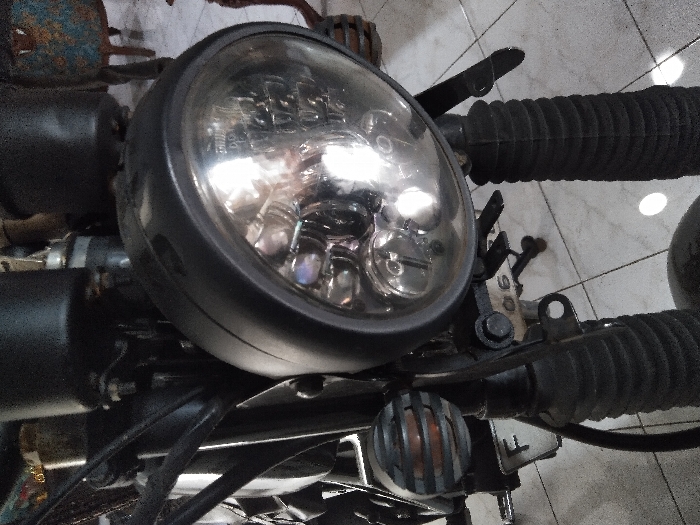 - "The image displays the front section of a dark-colored motorcycle or similar two-wheeled vehicle, observed indoors on a tiled floor in what is stated to be Majdalena, Czechia" by FM-HOzxy1, licensed under CC BY 4.0
