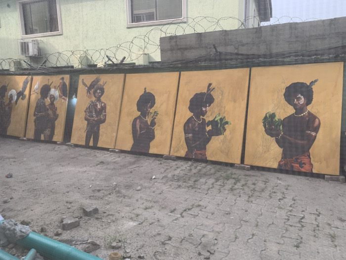 Seven paintings lean against a gray wall topped with barbed wire. Each canvas features a dark-skinned person with an afro hairstyle adorned with feathers. The figures are similarly posed; the paintings depict a progression of holding greenery. The backgrounds are a yellowish color. The paintings sit on concrete with some pipes visible in the foreground. A building is in the background.