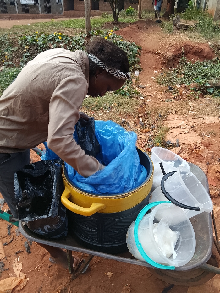 This image depicts a female individual engaged in packaging or sorting activities within Ukwu-Abwa, Nigeria