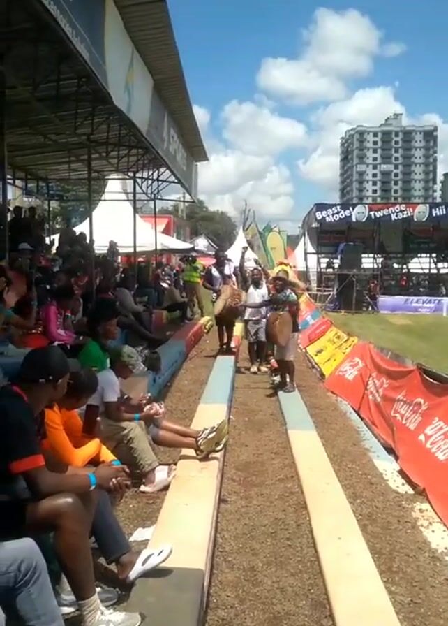 scene at a stadium or arena. A large crowd fills the stands, and there are people playing traditional drums and instruments while walking on a pathway between the stands and the field. Many people in the crowd are cheering, waving, and taking pictures with their phones. A woman in the foreground is holding a Kenyan flag. The environment includes stadium seating with a covered roof, advertisement banners, and buildings in the background. The sky is blue with scattered clouds.