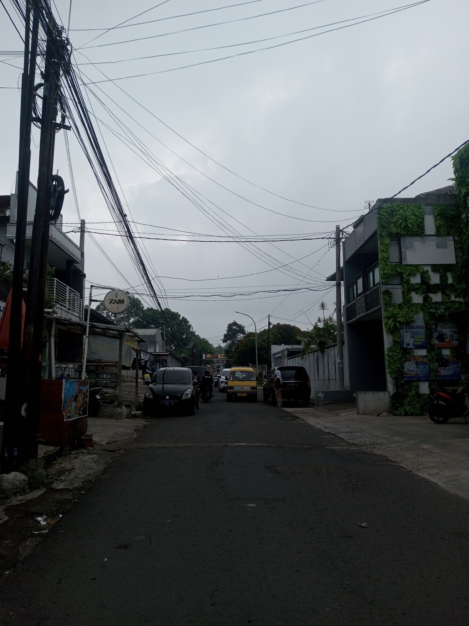 This image depicts a narrow, asphalt-paved urban street in the city of Houaythat, Laos, under an overcast sky. The street is lined with buildings and utility poles, heavily laden with tangled black overhead wires that crisscross the frame. On the left side of the street, a dark utility pole stands prominently, supporting a dense cluster of electrical and communication wires. Behind it, a two-story building with a white-railed balcony is visible. Adjacent to this building is a makeshift commercial stall with a grey tarp roof, featuring a circular satellite dish antenna marked with "7JAM" and a crescent moon logo. A black Suzuki Karimun (license plate D 1498 ZC) is parked or stopped on the roadside. A person stands near this vehicle, and a motorcycle is partially visible behind it. Further down the street, additional vehicles and structures are discernible. On the right side of the street, a multi-story grey building is extensively covered in green ivy or climbing plants. Several large posters, advertising services like "U-TABUNG" and "UMROH," are affixed to its facade. A red motorcycle is parked on the sidewalk directly in front of this building. Further along, a yellow vehicle, possibly a compact van or taxi (license plate B 1697 JM), is stopped or parked, and a person wearing a white head covering stands near it. The road itself shows minor wear and scattered debris. The overall scene suggests a busy, residential or commercial district.