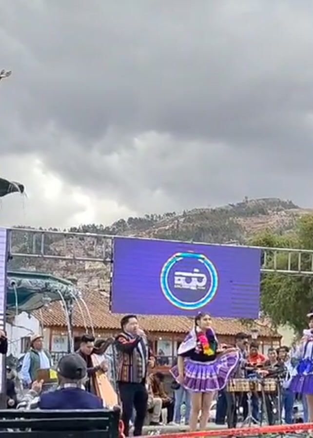 A performance is taking place in a public square in Peru. A statue of a man stands atop a fountain in the background. Behind the performers is a sign. Several people dressed in traditional Peruvian attire are singing and dancing. Musicians are playing instruments. The background shows a hillside of buildings, and the sky is cloudy. There are people watching the performance.