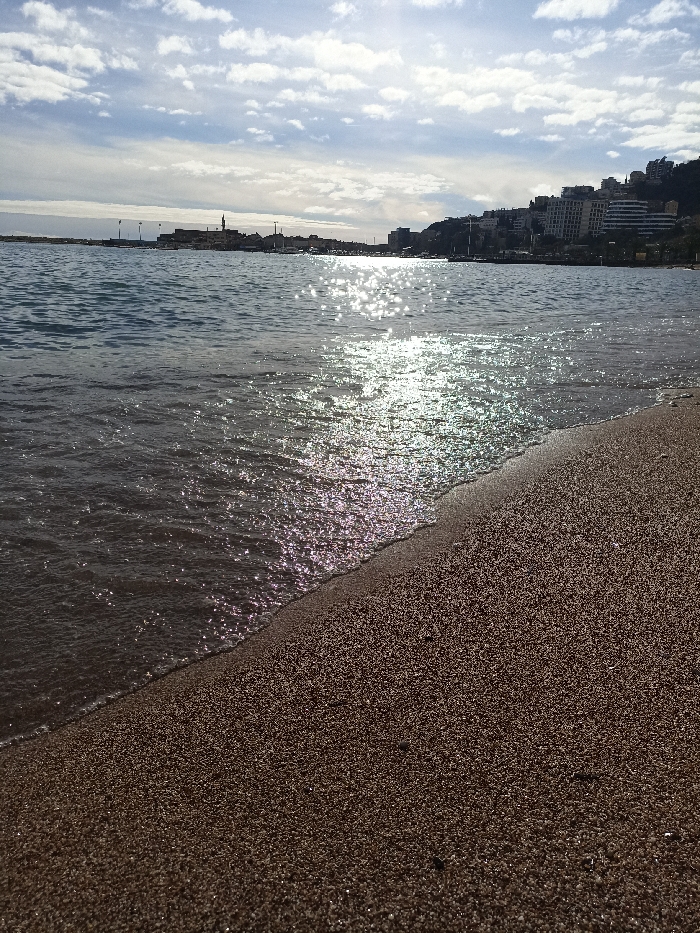 The image presents a panoramic coastal scene in Budva, Montenegro, captured from a low perspective on a beach. The immediate foreground, occupying the lower right, consists of a coarse-grained, dark brown pebbled beach. Small waves are observable along the shoreline, creating a wet boundary. The midground is dominated by a body of water, identified as Budva Bay, featuring a prominent band of intense sunlight reflections shimmering across its surface, extending from the horizon towards the viewer. The water itself appears dark blue-grey with minor ripples. In the distant background on the left, the fortified Old Town of Budva is visible, characterized by historical architecture and a distinctive spire or tower. To the right, a hillside rises from the coastline, densely populated with modern, multi-story buildings, likely residential or commercial structures. The sky above is partly cloudy, with white, diffuse clouds scattered against a light blue expanse, through which bright sunlight illuminates the scene. No individuals or overt human activities are depicted.