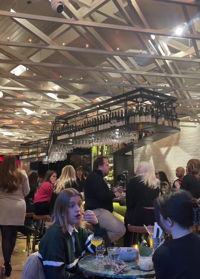 interior of a busy restaurant or bar. People are seated at tables and at the bar. The bar is centrally located and has a metal structure above it displaying rows of wine bottles and hanging glasses. The ceiling has a modern, geometric design with exposed lighting. Several patrons are actively engaged in conversations. One individual is seen eating at a table in the foreground. Another person seated at the bar gestures with their arm. The atmosphere appears lively and social.