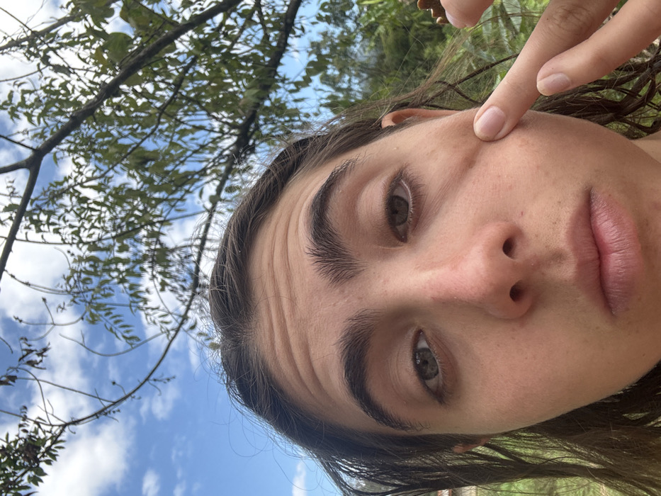 An eye-level close-up, angled, capturing a young woman against a natural backdrop. Her finger touches her cheek near the ear, possibly indicating a point of focus. The shot is from a low angle, allowing a glimpse of the sky and leafy tree branches. The woman's expression is neutral, with focus on her eyes and overall complexion. Natural light illuminates her features, highlighting texture and skin tone.
