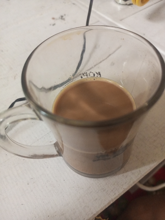 - "A clear glass mug sits on a white surface, filled with a light brown liquid, likely coffee with milk" by FM-JIlGY2, licensed under CC BY 4.0