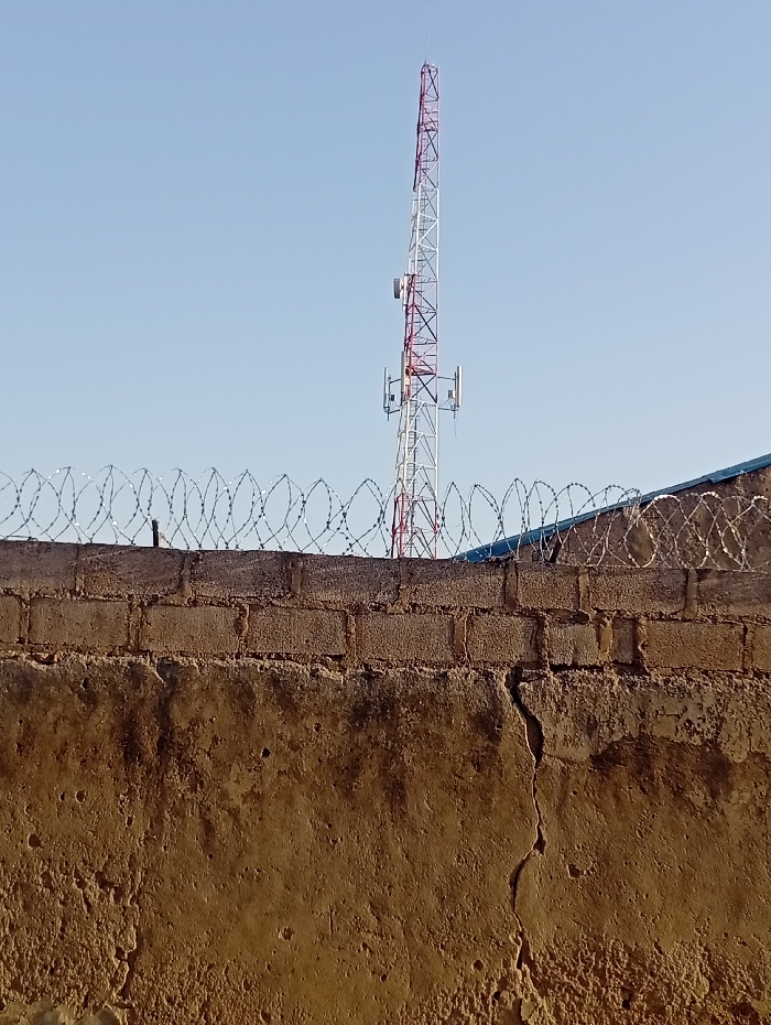 - "A tall, red and white communication tower rises behind a textured, brown wall topped with razor wire" by FM-F27nC2, licensed under CC BY 4.0