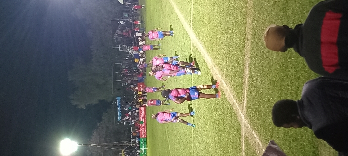 This image depicts a nighttime scene at a rugby pitch in Nairobi, Kenya