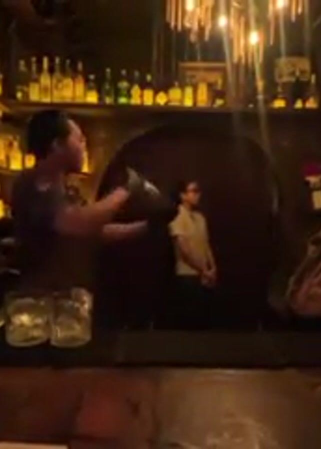 The scene takes place inside a dimly lit bar. The shelves behind the bar are lined with numerous bottles of liquor, illuminated by a warm, yellowish light. A chandelier made of what appears to be natural materials hangs above. A bartender, wearing a dark shirt, is standing behind the bar. He is actively shaking a cocktail shaker with exaggerated movements. In the background, another person is standing near an arched doorway, and another person is seated at the bar to the right. The bar is made of dark wood. Two clear glasses are on the bar in the foreground, and cocktail-making tools are visible. The lighting and decor give the bar a tropical or tiki-style atmosphere.