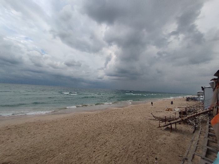 The image depicts an overcast coastal scene at Al-Mawasi. A wide, light brown sandy beach occupies the lower and mid-ground, extending from the viewer's perspective towards the distant horizon. The sea, characterized by greenish-blue water and visible whitecaps from breaking waves, borders the sand on the left side of the frame. The sky is dominated by dense, dark grey storm clouds, covering approximately two-thirds of the upper frame. Approximately four individuals are present on the beach. One figure, dressed in dark clothing, walks near the water's edge in the mid-ground. Two smaller figures are further down the beach to the right, and another faint individual is visible in the far distance. Their specific actions are limited to walking. On the right side of the image, a series of makeshift or unfinished structures line the edge of the beach. The closest structure in the foreground appears to be multi-level, with exposed building materials and an orange fabric hanging. A dilapidated wooden staircase or ramp, with metal railings, descends from these structures onto the sand. Various debris and discarded materials are scattered around the base of these structures and on the adjacent sand. Further along the coastline to the right, additional simple shelters or buildings are visible. Wooden planks and what appears to be scaffolding are present in the bottom right corner.