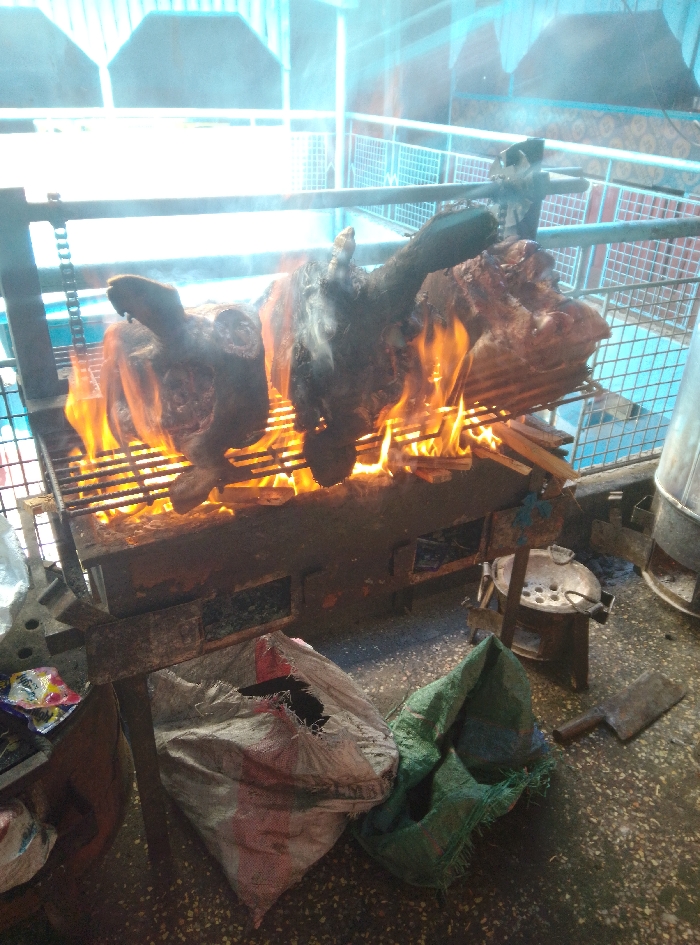 - "A large metal grill system occupies the central foreground and midground, actively roasting two animal heads, likely goat or lamb, and several substantial cuts of meat over an open flame" by FM-c9RUg1, licensed under CC BY 4.0