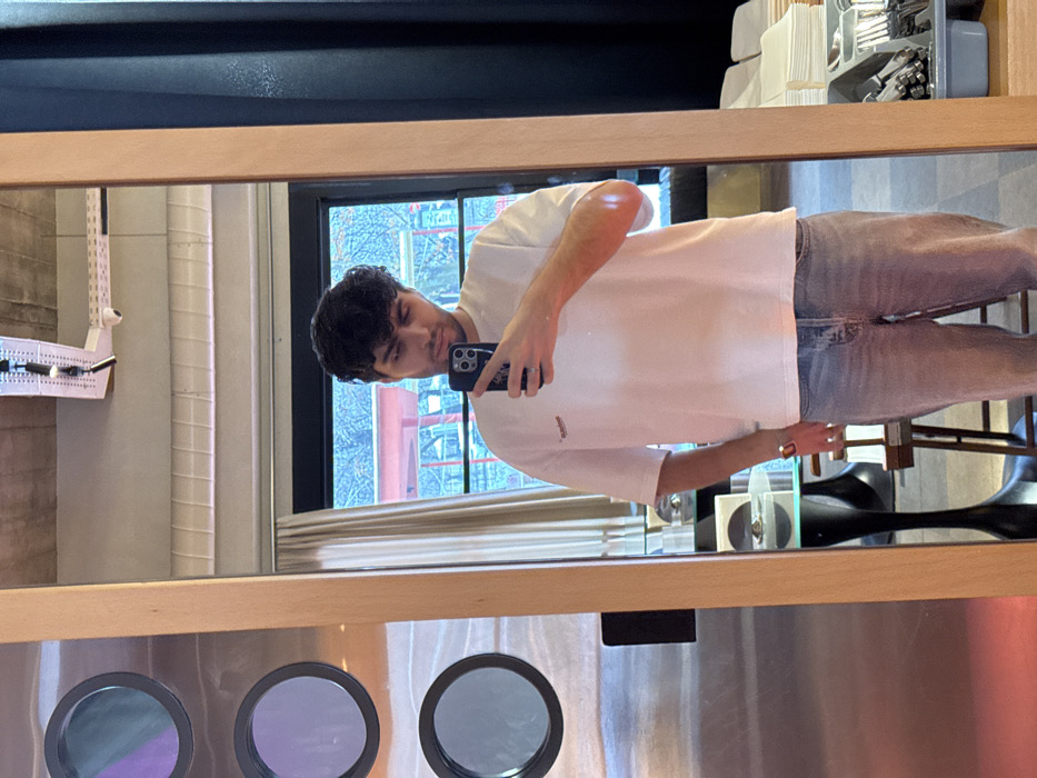A person stands in front of a large, rectangular mirror, taking a selfie