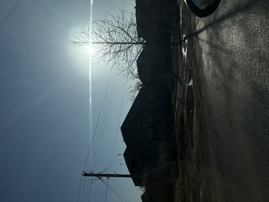 The image depicts an outdoor scene in Yablonovskiy, Russia, under clear skies with intense backlighting from a low-lying sun positioned in the right-center. A prominent horizontal lens flare extends from the sun across the mid-frame. In the foreground, an asphalt road surface occupies the bottom half, featuring several reflective puddles. A portion of a dark vehicle's side mirror is visible in the extreme lower-right corner. The midground features a tall, bare deciduous tree silhouetted directly against the sun on the right. To the left, a utility pole supporting multiple overhead electrical lines stands prominently. Behind the utility pole, a residential building with a dark roof and multiple shadowed windows is visible. The structure appears to be two stories. Sparse, dry vegetation is present on the ground between the road and the buildings. Another building's roofline is partially visible behind the tree on the right. The background consists of indistinct structures and bare trees, all heavily shadowed. No individuals or animals are present.