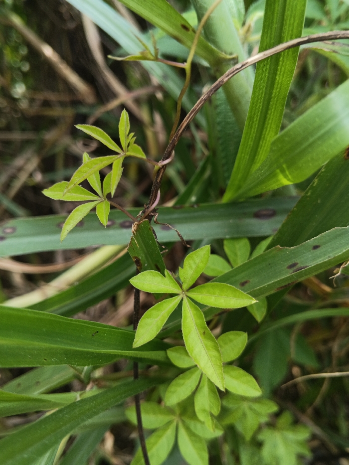 The image displays a close-up of dense plant foliage within a natural outdoor environment in Buyantashi, Zambia. The primary subject is a climbing plant featuring vibrant, light green, palmate leaves, each composed of approximately five leaflets. A slender, dark brown vine-like stem of this plant is visible, partially obscured by the leaves. Surrounding and intertwining with the climbing plant are broader, darker green leaves with distinct parallel venation, consistent with grass or similar monocotyledonous plants. Several of these broader leaves exhibit small, irregular dark brown spots. The foreground elements are in sharp focus, while the background appears softly blurred, showing additional foliage and hints of brown stems. No human figures, animals, or specific actions are depicted. The scene is illuminated by natural light.