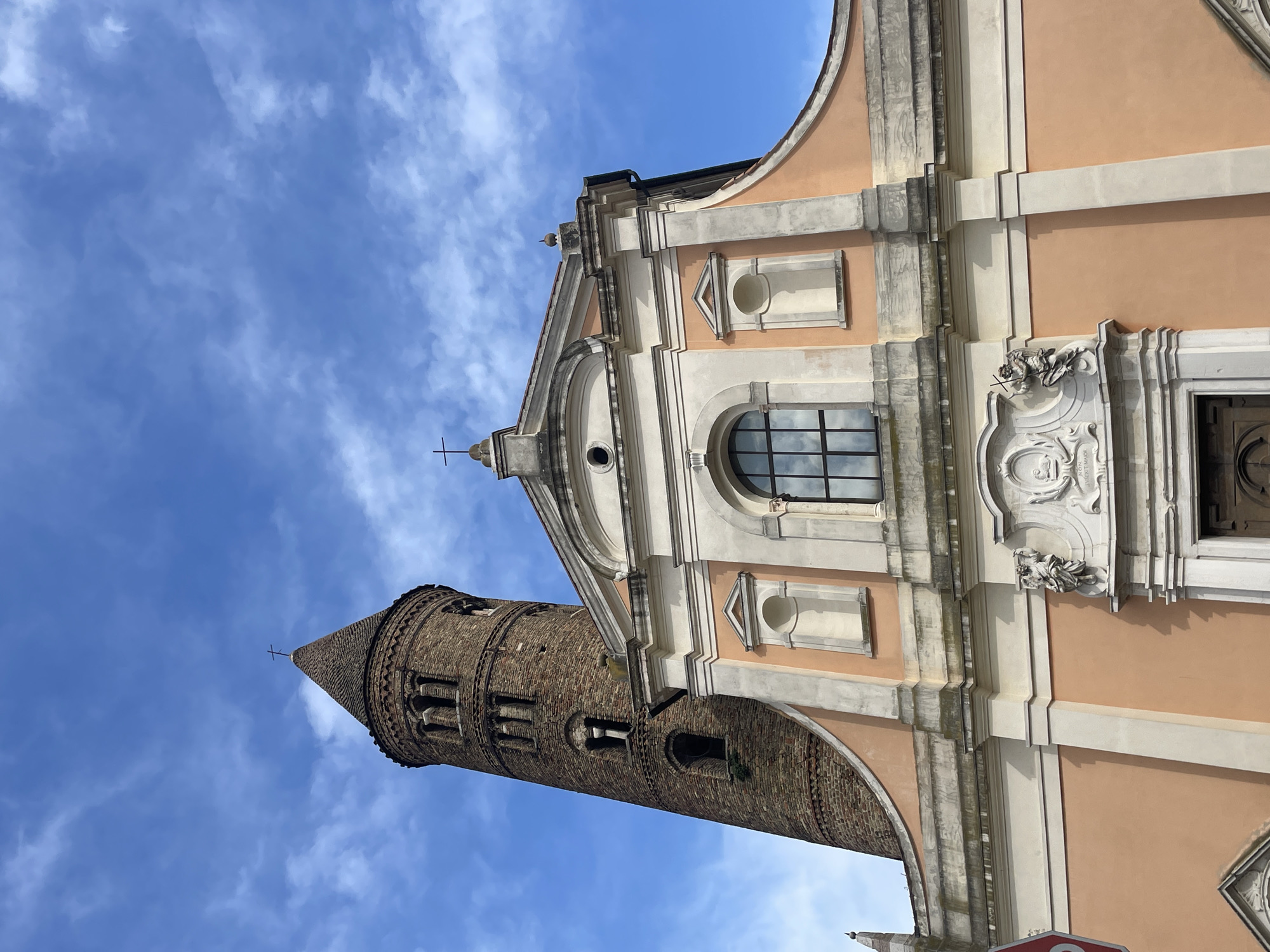 A low-angle, outdoor shot shows the Basilica di San Giovanni Evangelista in Ravenna, Italy. The Basilica's facade is visible, featuring peach-colored walls with white and gray stone accents. A large, arched window is centered, with smaller oval windows on either side above. The facade is topped with a triangular pediment. To the left of the Basilica, a tall, cylindrical brick bell tower rises. The tower is capped with a conical roof and a cross. The sky is blue with scattered white clouds.