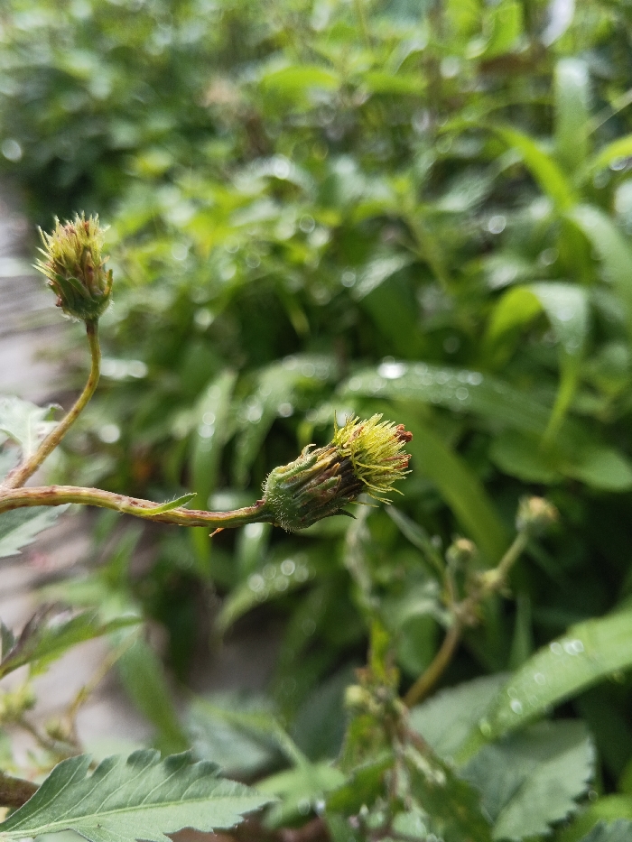 Two green buds, one more open with yellow filaments, grow from a thin, brown stem. The background features various shades of green foliage, some blurred. Dewdrops cling to the leaves. A glimpse of a gray surface appears near the bottom left corner. The image is taken in natural light, creating a soft, shallow depth of field.