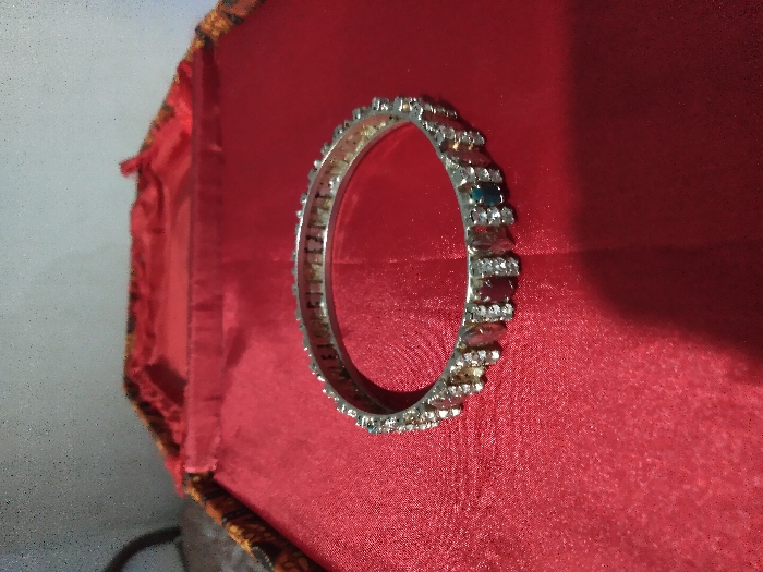 - "A metallic, silver-toned bracelet adorned with a continuous line of rectangular, faceted gemstones (including clear, red, blue, amber, and green) rests horizontally within the open interior of a decorative box" by FM-HOzxy1, licensed under CC BY 4.0