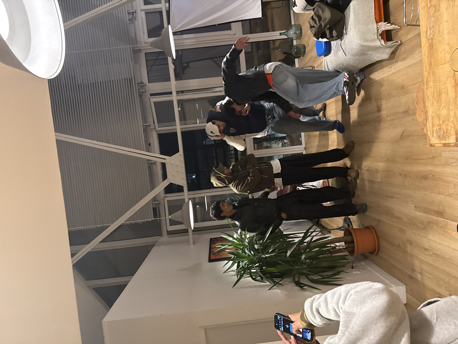 The image depicts an indoor scene within a modern residential or studio space in Saint-Denis, France, at nighttime. The setting features light-colored wooden flooring, white walls, and a white ceiling with exposed structural beams and large windows fitted with horizontal blinds, revealing darkness outside. Two grey conical pendant lights illuminate the area from above. Six individuals are present. In the immediate foreground, a person, partially visible, holds a black smartphone horizontally, actively viewing its screen. To the left, a male with dark, curly hair stands, dressed in a dark jacket and pants. Next to him, a male with a dark brown hooded sweatshirt, white undershirt, and dark pants stands with his arms crossed. To their right, a male wears a white baseball cap with a 'P' logo, a dark blue vest over a white long-sleeved shirt, blue jeans, and light blue footwear, with his right hand on his cap. This individual appears to be interacting with or supporting the adjacent male, who is captured mid-movement with his left leg raised and right arm extended. This male wears a dark jacket, an orange garment underneath, baggy light blue jeans, and dark sandals with white socks. A sixth, less distinct figure is partially visible in the background between the two rightmost individuals, wearing light-colored pants. Objects in the room include a large green potted plant on the left, a framed artwork on the wall behind it, and a light-colored wooden coffee table in the foreground. On the right, a sofa or bench is covered with a grey blanket, upon which a dark bag and a blue plastic tub are placed. Several clear glass carboy-style bottles are arranged on the floor near the windows on the right side of the frame.