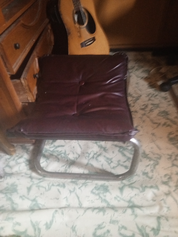 A maroon vinyl chair with a chrome frame sits on a patterned white and green sheet. To the left, a wooden dresser with one drawer slightly ajar is visible. A guitar leans against the dresser and a dark wooden wall is in the background. The lighting in the room appears dim and casts shadows.