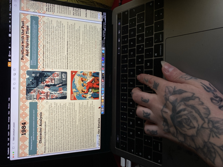 An overhead, slightly angled view shows a silver/space gray MacBook Pro laptop with its screen displaying educational content, with a heavily tattooed human left hand positioned on its QWERTZ keyboard. The laptop screen presents a "Freeform" application titled "1984 Literature Lesson," featuring sections on "Character Analysis" (Winston Smith) and "Parallels with the Past And Current Time," which include text and imagery related to George Orwell's *1984*, such as "Big Brother" iconography and Soviet-era propaganda-style artwork labeled "Russia." The macOS menu bar is visible at the top, indicating the time "23 Magha." A dark USB-C hub/adapter is connected to the laptop's left port. A left human hand, heavily tattooed with a large rose design on the back and various Gothic-style letters and symbols on the fingers and wrist, rests on the laptop's keyboard. The index finger is positioned over the 'J' key, while other fingers are poised over adjacent keys. The fingernails are visible, with the pinky nail appearing elongated. Mild redness is observable on the skin of the fingers. The immediate background is dark, indicating an indoor setting, with a subtle hint of red/orange material visible in the upper right. The image contains no details identifying the city of Kunje, Montenegro.