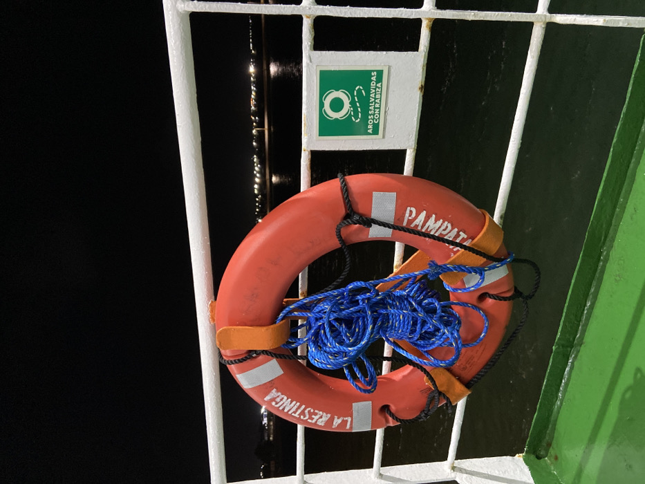 An orange life preserver with white reflective stripes and blue rope is attached to a white metal railing. The words "PAMPATA" and "LA RESTINGA" are printed on the ring. Above the life preserver is a green sign with a white image of a life preserver and the text "AROS SALVAVIDAS CON RABIZA". The background is mostly dark, with a green surface visible on the right and distant lights on the left.