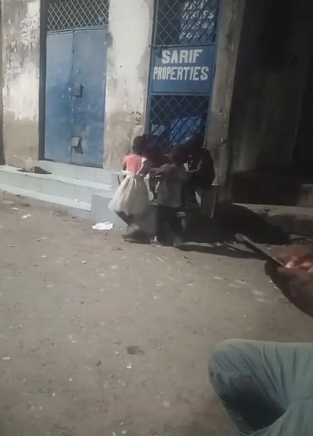 In a dimly lit outdoor scene, a person holds a phone in their hand, filming. In the foreground, part of the person's green pants and arm are visible. In the background, there's a building with a sign that reads "SARIF PROPERTIES". A blue door with a metal grate is next to the sign. Three children are in front of the building. One child is standing on the steps of the building, wearing a white dress with a pink top. Another child stands on the ground, wearing dark pants and a light-colored shirt. A third child is sitting on a ledge. A man walks into the scene behind the children. The ground appears to be paved. The overall tone suggests a casual, observational recording of a neighborhood scene.