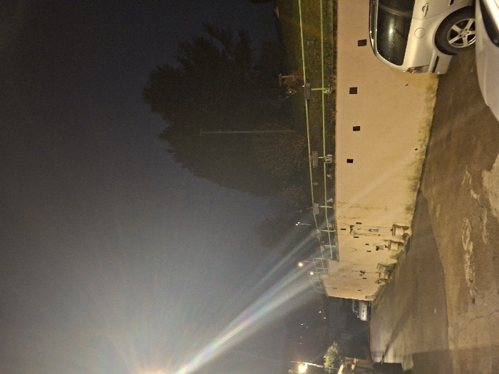 At night, a car is parked beside a high wall with dark squares. A green handrail runs along the wall. The wall has various protrusions and cracks. Beyond the wall, trees are visible against a darkening sky. Light reflects off the street. Other streetlights twinkle in the distance.
