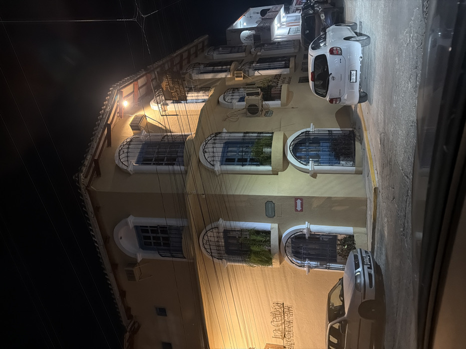 A multistory tan building with arched, grilled windows and blue trim is illuminated at night. A small white car is parked on the sidewalk next to the building, with other cars parked nearby. Power lines crisscross in the sky above. The building's facade features a sign that reads "La Cantera." Street lighting casts shadows, and the sky is dark. The image appears to be taken from inside a vehicle, with part of the car visible.