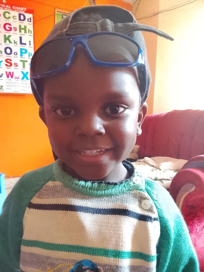 An indoor, waist-up portrait depicts a smiling young child, approximately 2-5 years old, of African ethnicity, situated within the city of Kiambu Township ward, Kenya