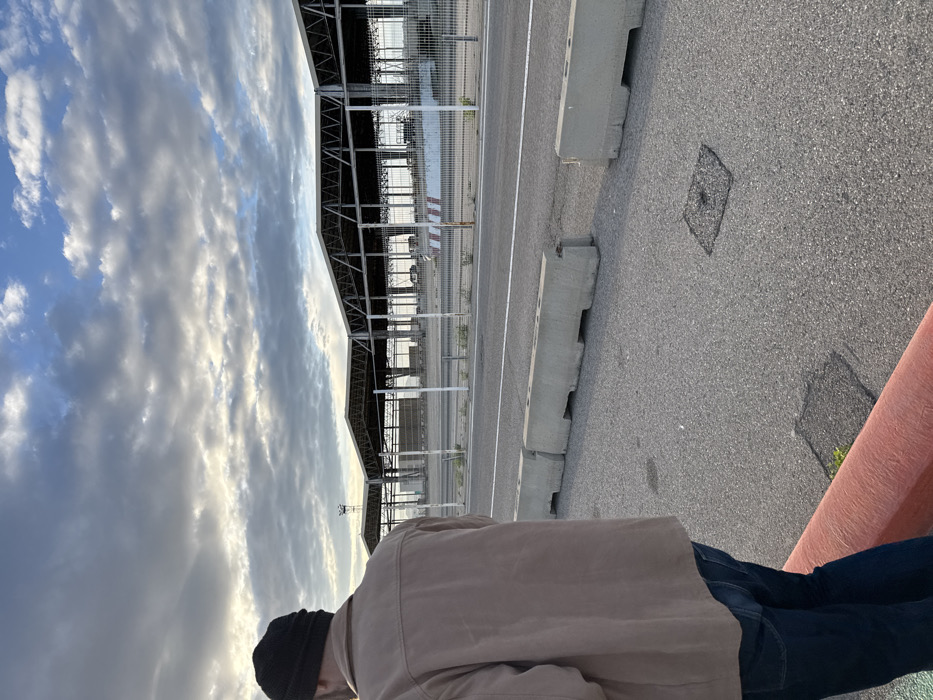 The image displays an outdoor industrial scene, identified as the commercial port area of Marseille, France. The sky is largely overcast with scattered stratocumulus clouds, revealing patches of blue. In the foreground, an individual is positioned with their back to the viewer, partially cropped by the left and bottom edges. This person, an adult male, wears a black knit beanie, a light brown collared jacket, and dark blue jeans. He stands on an asphalt surface. A red-orange painted concrete curb is visible along the bottom left, with minor green vegetation growing from cracks in the asphalt. Two square metal utility covers are set into the asphalt further right. Separating the foreground from the mid-ground is a series of light gray concrete barriers. Beyond these barriers lies a paved road marked with a solid white line. Further back, a metal mesh fence supported by white vertical posts establishes a boundary. The background is dominated by large, open-sided industrial structures featuring multi-faceted metal roofs supported by exposed metal trusswork and numerous vertical support columns. The interiors of these structures appear largely empty, with concrete foundations visible.