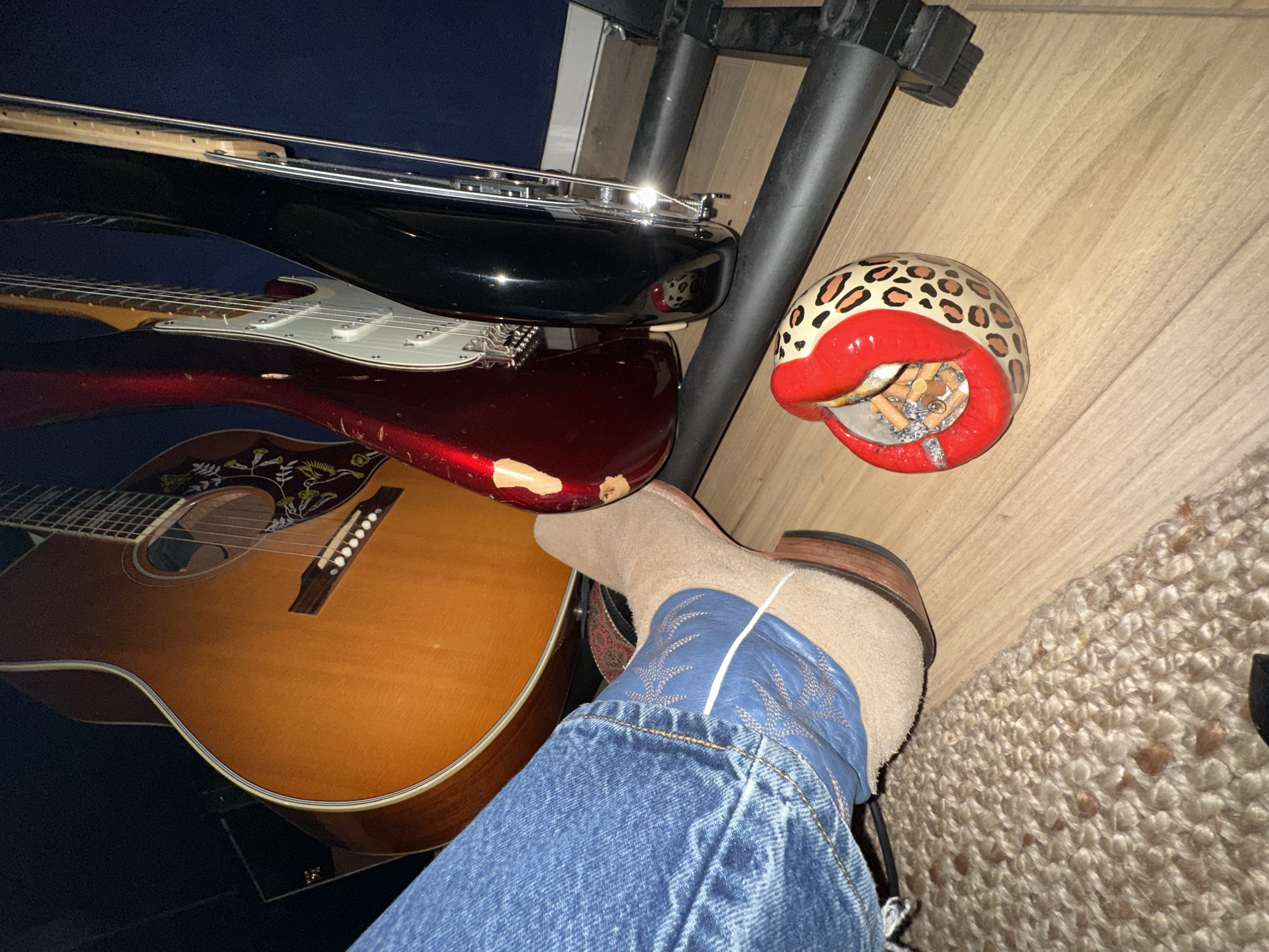This indoor scene is situated in Paris, France. The foreground features the lower left leg of a person, clad in blue denim jeans, with a tan suede cowboy boot adorned with blue embroidered patterns visible on the foot. The boot rests partially on a light brown, coarsely woven rug. The background consists of a dark blue wall. On a light-colored wooden floor, three guitars are positioned vertically. From left to right, these include a natural wood acoustic guitar with decorative inlay around its soundhole, a red electric guitar with a white pickguard and notable paint chipping on its body, and a black electric guitar. The electric guitars are supported by a black, horizontal guitar stand visible on the floor. To the right of the person's boot and in front of the guitars, a decorative ashtray in the shape of red lips with a leopard print base sits on the wooden floor, containing multiple discarded cigarette butts. A dark, box-like object, possibly an amplifier, is partially visible against the wall behind the acoustic guitar.