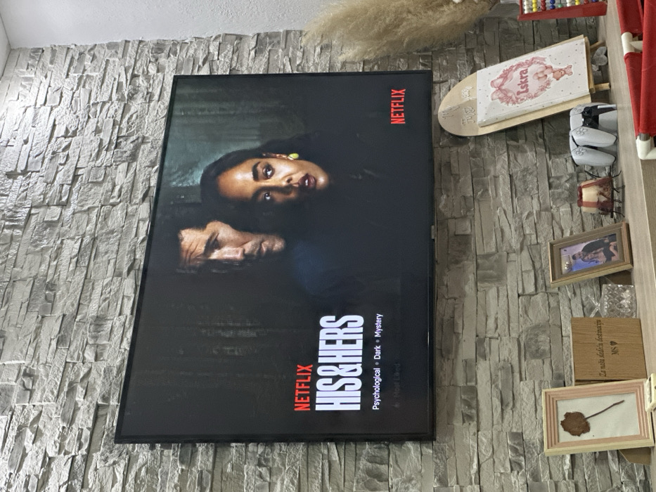 A TV screen displays "His & Hers" on Netflix, categorized as psychological, dark, and mystery