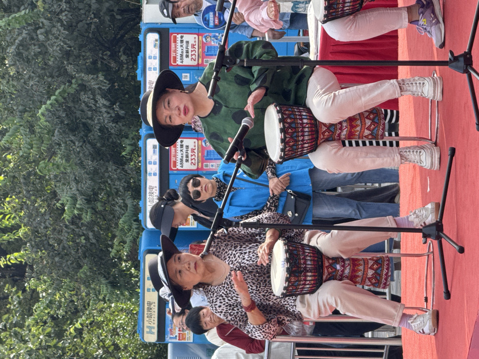 An outdoor performance is depicted in a public area within Daxing District, China. Two women are seated on stools, actively playing djembe drums on a red carpeted surface. The woman on the left wears a black wide-brimmed hat, a leopard print blouse, light-colored pants, and white/beige sneakers, with her hands positioned over her drum. A microphone on a stand is in front of her. The woman on the right wears a black wide-brimmed hat with a gold band, a dark green polka-dotted long-sleeved top, light-colored pants, and white platform sneakers, with her right hand poised over her drum. A microphone on a stand is also positioned in front of her. Both drums have colorful patterned bases and white drumheads. Behind a metal barrier, several individuals observe the performance, including a woman in a blue vest and sunglasses. The background features a row of blue "小哈换电" (Xiao Ha Huan Dian) battery swapping stations, displaying Chinese text indicating "48Max大锂电 全新升级 233元" (48Max large lithium battery, new upgrade, 233 yuan). Dense green foliage is visible above these machines. The scene is brightly lit.