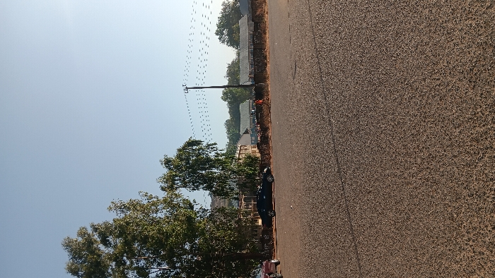 A side view shows a road with a rough texture on the right. A power pole is seen in the middle distance against a hazy blue sky. A pattern of dark dots is dispersed above the pole, extending towards the horizon. A few buildings are visible behind lush green trees. Parked vehicles are near the trees, adding to the scene. The ground appears dry and reflects a warm hue.