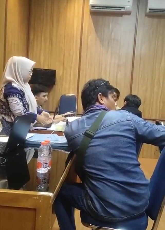 group of people in a room with wood-paneled walls. There are three air conditioning units on the wall. A woman wearing a hijab stands at a table with a laptop, papers, and a bottle of water. Several men are seated around the table, some with laptops. One man is wearing a denim jacket. Another man is wearing a yellow safety vest. The people appear to be in a meeting or training session.