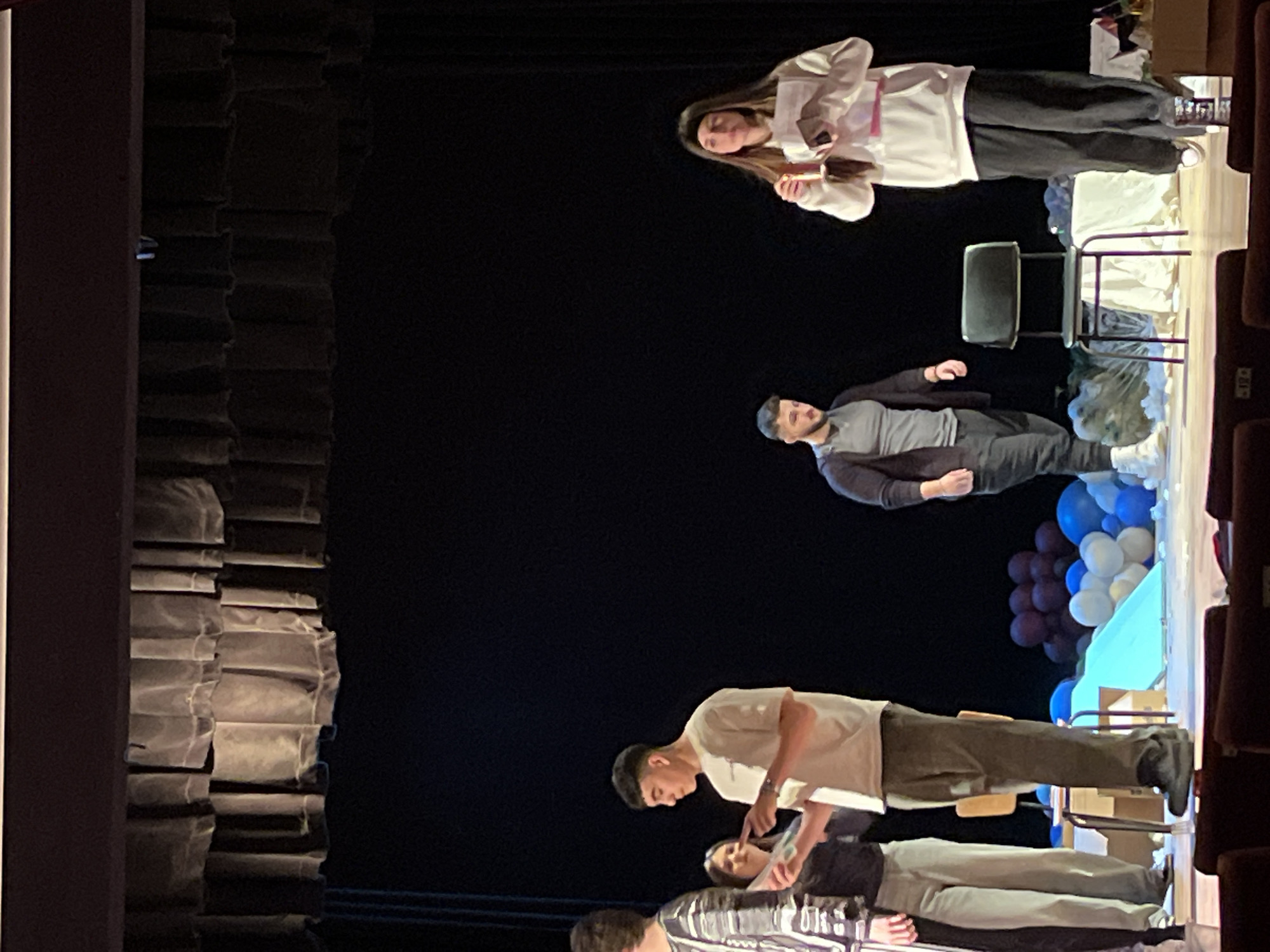 The image depicts a scene on a stage. Three individuals are standing near the bottom of the image, facing the right side of the image. The man in the middle is pointing to the face of the woman next to him. Above them is another individual standing on the stage. Further up in the image is a female individual on the stage facing left. Balloons can be seen near the right side of the image. This image was taken on stage in Nova Zagora, Bulgaria.