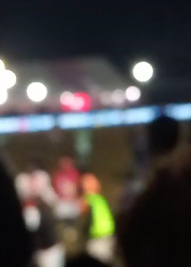 group of people gathered on a grassy field at night. In the background, there is a large white tent with lights and a crowd of spectators is visible on the other side of the field. Several people are wearing bright yellow vests. Some individuals are running around the field, while others are standing and observing. The general atmosphere appears celebratory, with some people moving excitedly.