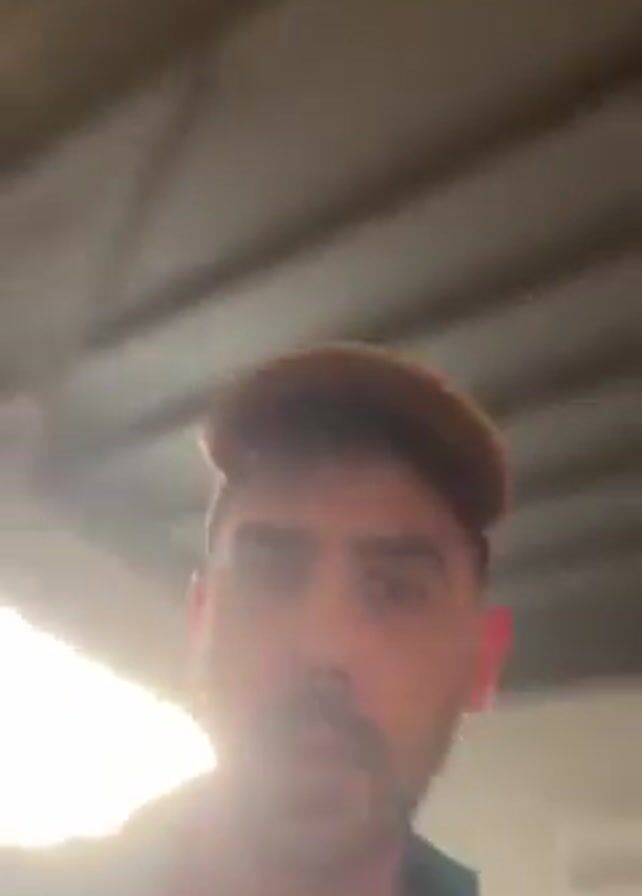 A man wearing a tan baseball cap and a light green shirt looks directly at the camera. He has dark hair, a mustache, and some stubble. He is in what appears to be an interior space with a corrugated metal ceiling. He briefly displays a rock and roll hand gesture to the camera. The lighting is bright, and there is a picture frame visible in the background.