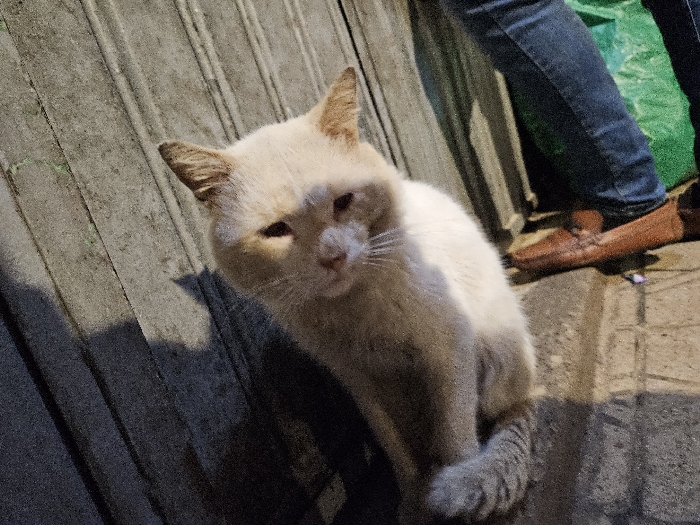 A cream-colored cat with pointed ears sits on a gray surface. The cat's gaze is directed toward the viewer. To the right, a person's leg is visible, clad in blue jeans and a brown leather shoe. A green object is partly visible near the leg. The background is a gray, textured wall. Shadow falls across the wall and the cat's body.
