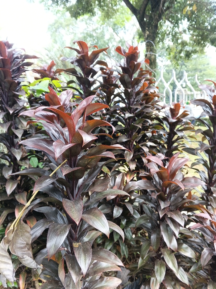 - "The image displays a dense cluster of Cordyline fruticosa plants, predominantly featuring dark maroon to reddish-brown, elongated leaves that cover the majority of the foreground and midground" by FM-DaOqm2, licensed under CC BY 4.0
