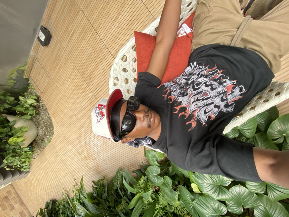 An individual is depicted seated in a white wicker-style armchair on a light-colored tiled patio in Moba, Nigeria. The subject is an adult male with dark skin, wearing black sunglasses, a black durag, a white baseball cap with a red brim and a stylized red and white logo, a black short-sleeved t-shirt with a flaming skull graphic in red, white, and grey, and tan cargo pants. He is leaning back against an orange cushion in the chair, with his right arm partially extended, consistent with taking a self-portrait. The immediate environment includes a section of lush green foliage to the left and in the background, a large grey planter containing plants, and a dark rectangular utility box resting on the tiled ground to the right. Portions of a tiled wall and a grey wall are visible in the upper background.