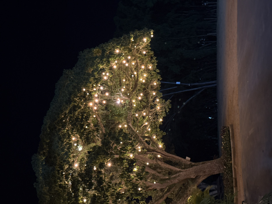 A large, dark green tree is adorned with many small, warm white lights, creating a festive atmosphere