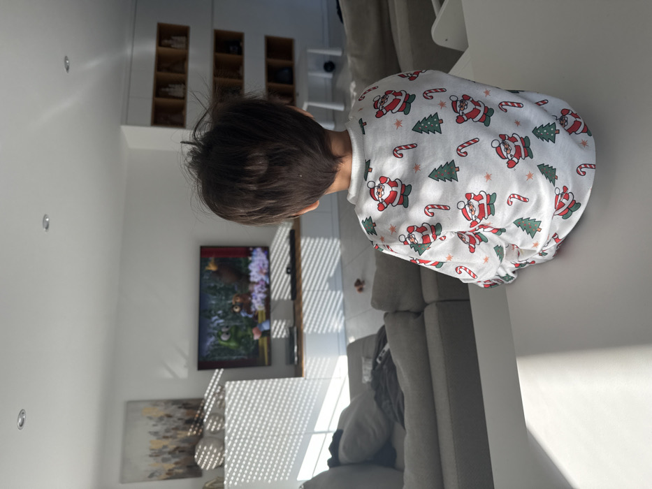 A young child, observed from behind, sits on a white, flat surface in a residential living room in Junglinster, Luxembourg, attentively watching a television screen. The child wears a long-sleeved white garment patterned with red Santa Claus figures, green Christmas trees, and red-and-white candy canes. Their dark hair is slightly disheveled. The flat-screen television, centrally positioned on a white wall above a low white cabinet with a wooden top shelf, displays an animated scene featuring a green, frog-like character and a brown, bear-like character amidst colorful elements. To the left, a light gray sectional sofa with a dark garment draped over it occupies the floor space. Above the sofa, an abstract painting with muted tones is mounted on the white wall. To the right, a white wall unit features multiple open square and rectangular shelves containing decorative items. The room is brightly illuminated by natural light entering from an unseen window, casting distinct horizontal shadow patterns from window blinds across the light-colored floor and parts of the wall. Recessed spotlights are visible in the white ceiling. A small, dark brown object rests on the floor in front of the sofa.