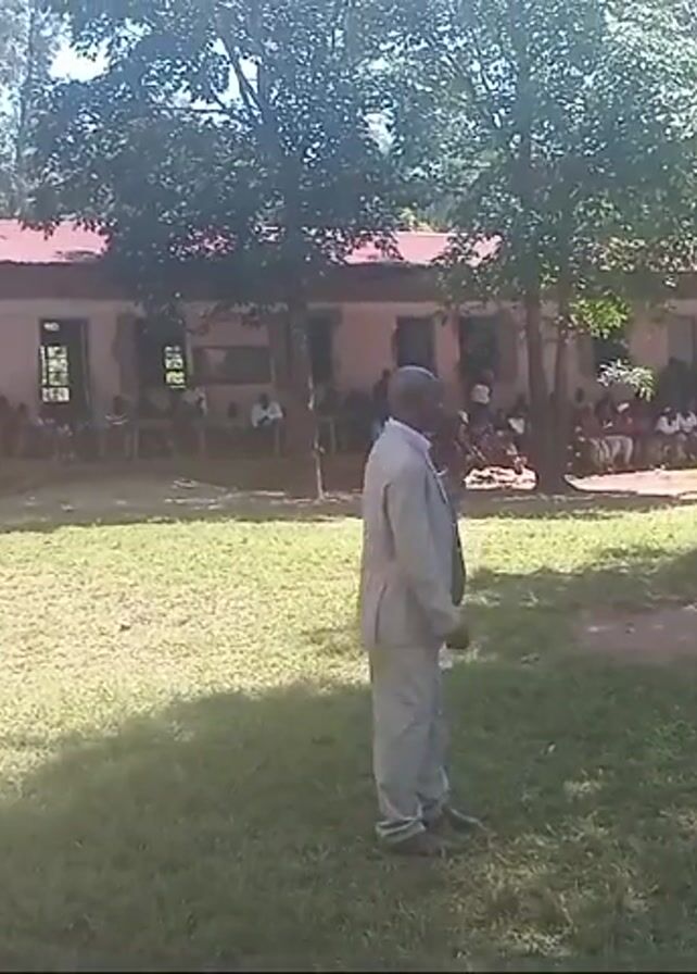 n outdoor event, possibly a school gathering, taking place on a grassy field with a building in the background. A man in a light-colored suit is standing on the grass facing a seated audience. The audience, composed of adults and children, is seated in rows on benches and on the grass. Some people are seated under a tent. A small table with water bottles is under the tent, and a person in dark clothing is placing something on the table. The sky is bright and there are trees around the field. The overall atmosphere seems to be formal and orderly.
