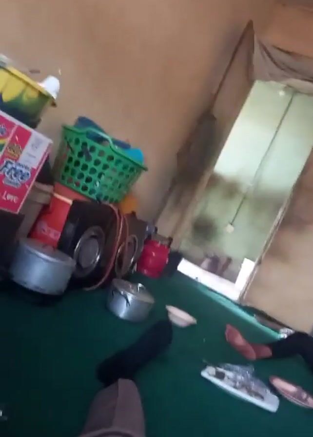 interior of a room. The walls are painted in a muted yellow color. There is an open doorway, and a pile of what appears to be kitchen supplies and a container of instant noodles are stacked on a table in the corner. Several people are seated on the floor, and their feet are visible. The floor is covered with a green mat. The camera moves erratically, focusing at times on the ceiling and then on the floor. The lighting in the room appears to be natural and coming from the doorway.