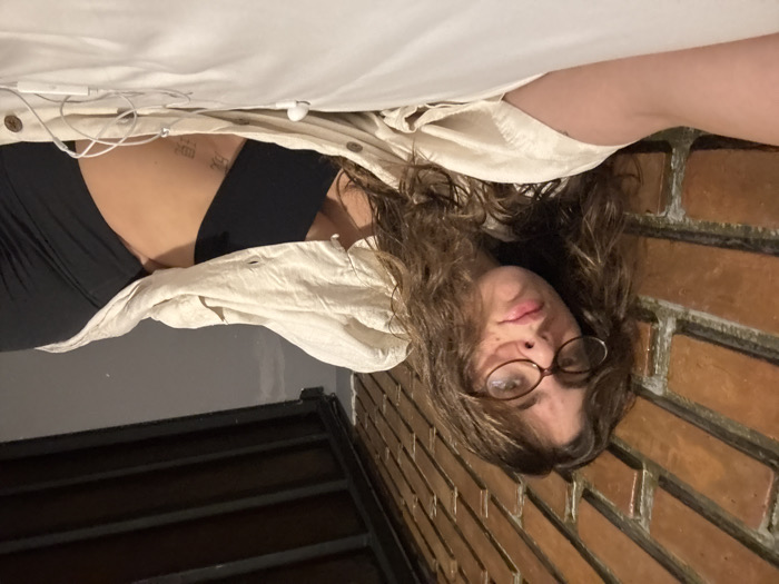 The image displays an indoor scene, likely a bedroom or hotel room. A female individual, appearing to be a young adult, is positioned on her right side, lying on a white sheet-covered bed. She has long, wavy brown hair and is wearing oval-shaped, brown-rimmed glasses. She looks directly at the camera with a neutral expression. Her attire includes a black top, black bottoms, and a light-colored (beige/off-white), unbuttoned, long-sleeved shirt partially draped over her torso. A tattoo, appearing to be characters, is visible on her right ribcage area beneath the shirt. Behind her head and upper body, an exposed red-brown brick wall is visible. Above her, a dark, horizontal structure, consistent with the underside of a bunk bed or elevated bed frame, is visible against a plain light gray wall. A set of white wired earphones is lying on the white bed sheet near her midsection. The lighting is moderate, highlighting the subject and the brick wall. Specific geographical markers identifying the location as Chiang Mai City Municipality, Thailand, are not discernible from the visual evidence within the image; however, the scene is consistent with an indoor room environment found in such a city.