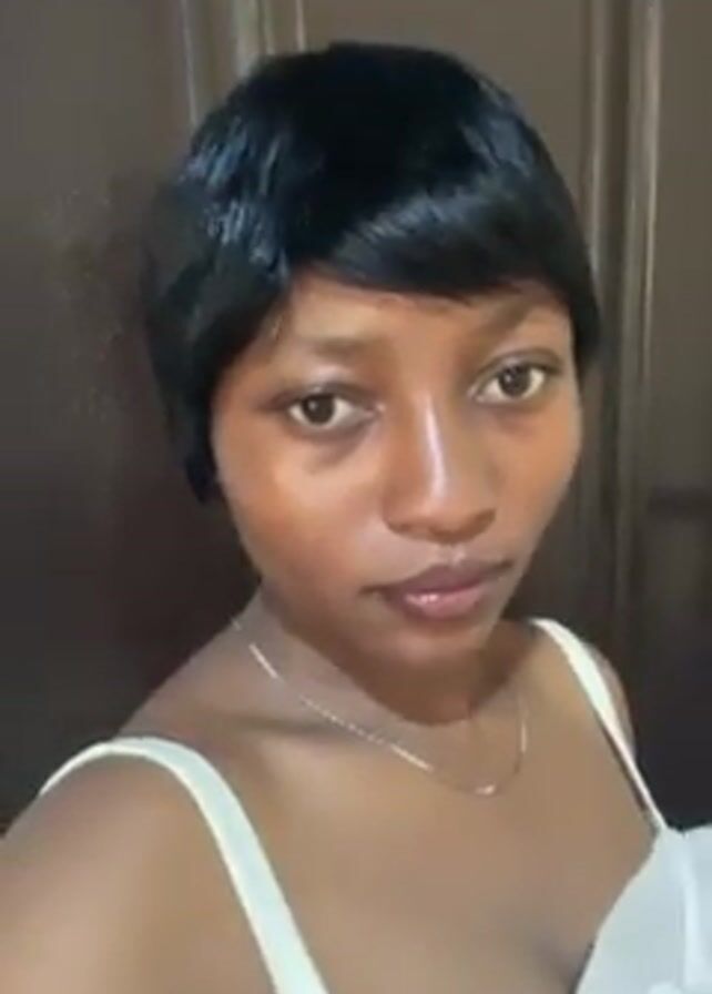 A woman with dark skin and a short black wig is standing indoors