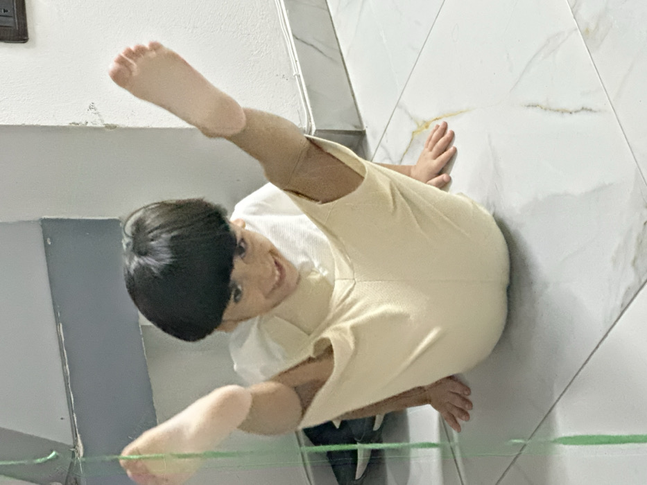 In Barza Municipality, Syria, an indoor scene depicts a child with short, dark, bowl-cut hair, seated on a light-colored, veined tile floor. The child wears a white short-sleeved top and light beige shorts, looking towards the camera with an open-mouthed smile. Both legs are bent and raised high, with bare feet pointed upward and outward in a wide V-shape. The child's hands are flat on the floor for support. A thin, bright green string hangs vertically on the left side of the frame. The background features a plain light-colored wall, a white baseboard, a partially visible dark object (likely footwear) behind the child's left side, a grey architectural element in the upper left, and a dark electrical switch or outlet on the upper right wall.