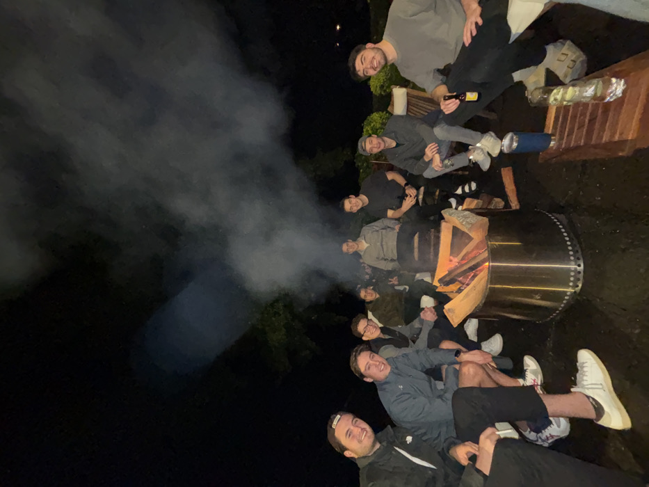 The image depicts nine adult males gathered around a stainless steel fire pit on an outdoor patio at night in Huasca de Ocampo, Mexico